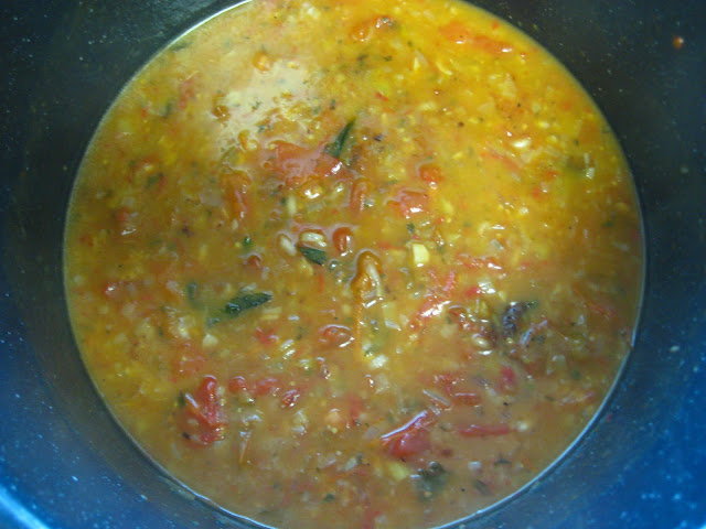 Add your tomatoes and roasted garlic pile, rice, sugar, basil leaves, parsley, and any other spices you want to use. Let this mixture cook for 15-20 minutes or until the rice is cooked. It should look slightly unattractive: