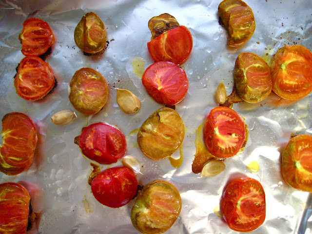 Preheat oven to 250. Slice all but 3 tomatoes in half lengthwise and arrange the sliced tomatoes on a baking sheet. Toss the 4 unpeeled garlic cloves onto the sheet and drizzle everything with olive oil. Bake for 90 minutes or until the tomatoes are soft and well-roasted.