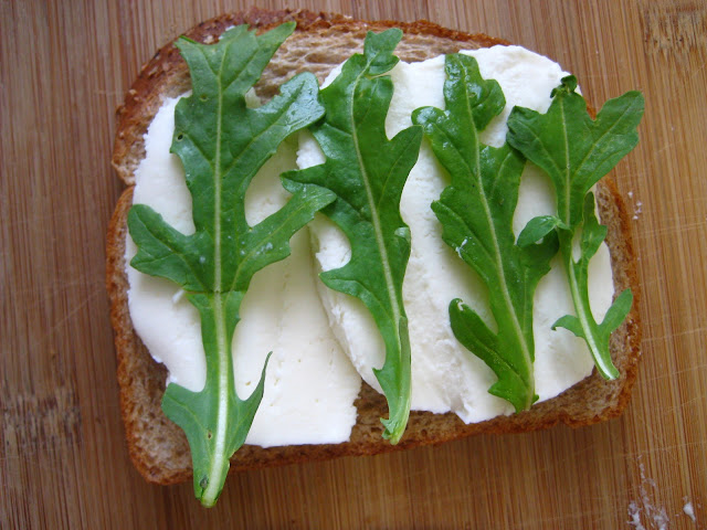 Easy. On one slice of bread, put 2 slices of mozzarella and top with the arugula. Add slice of bread #2.