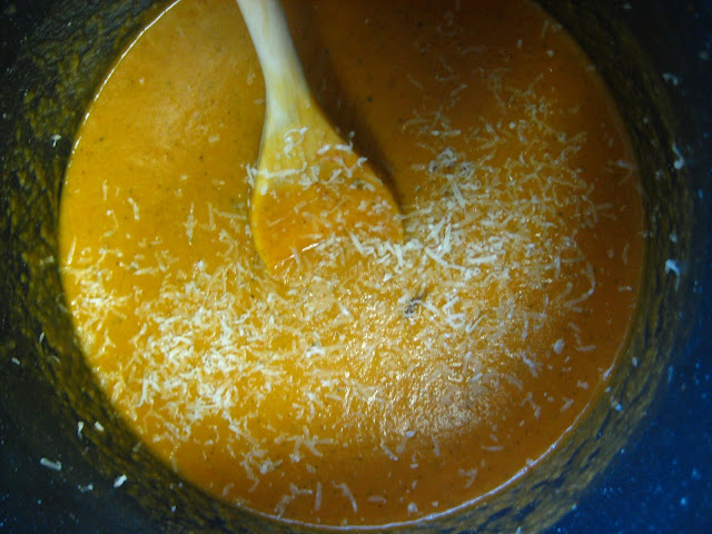 Using a regular blender (you may have to do 2 batches) or an immersion blender (get one!), blend up the mixture until it is nice and smooth. At this point, if you want, you could strain this through a fine mesh strainer or use a food mill to remove any leftover seeds and skins for an extra smooth soup. I added some Parmigiano Reggiano to mine.