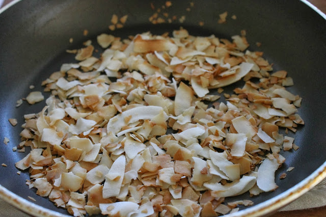- Lightly toast the coconut flakes in a pan over medium-high heat, tossing occasionally to ensure even browning. Remove from heat when golden brown.